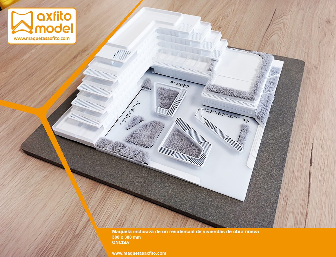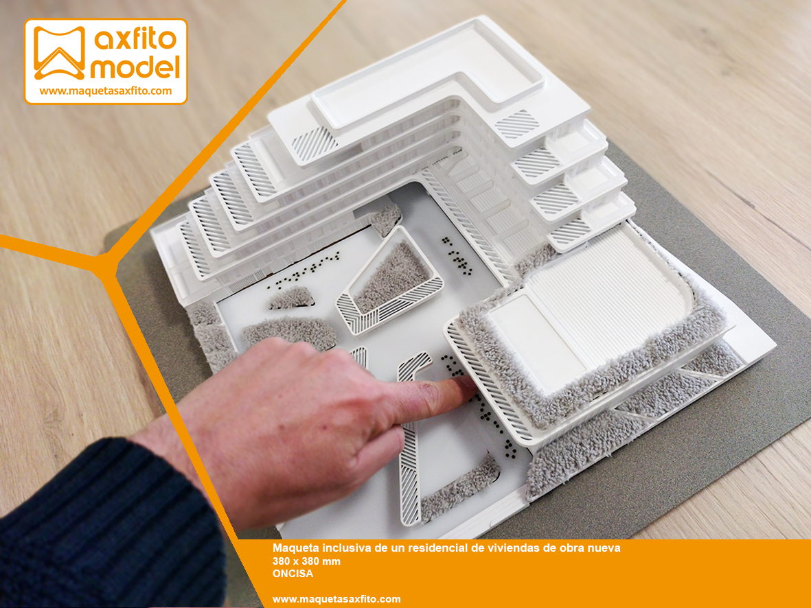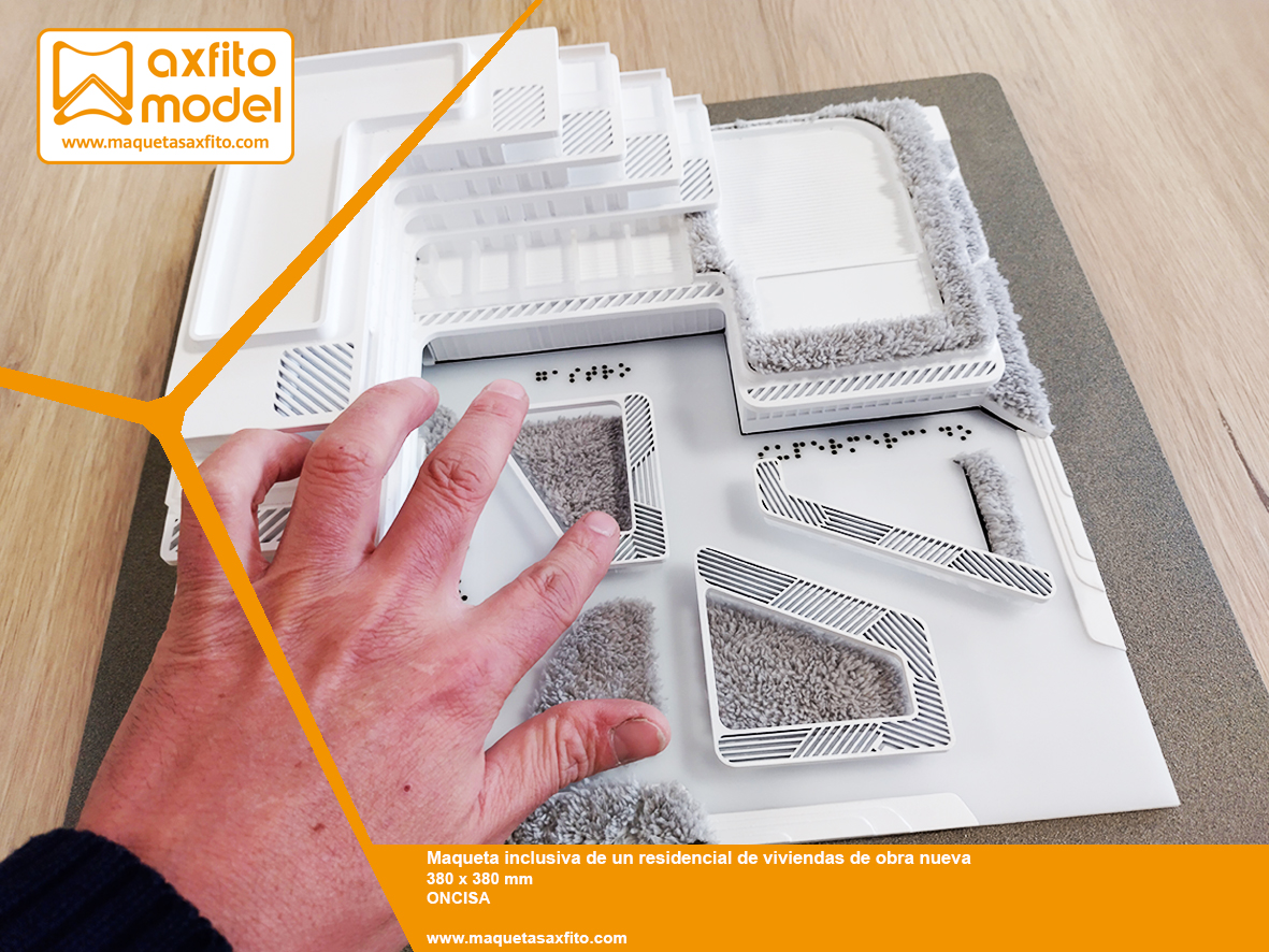 La maqueta ha sido representada a la escala 1:250 y está especialmente diseñada para que las personas ciegas puedan interpretar los detalles y diferentes zonas de interés de este proyecto.