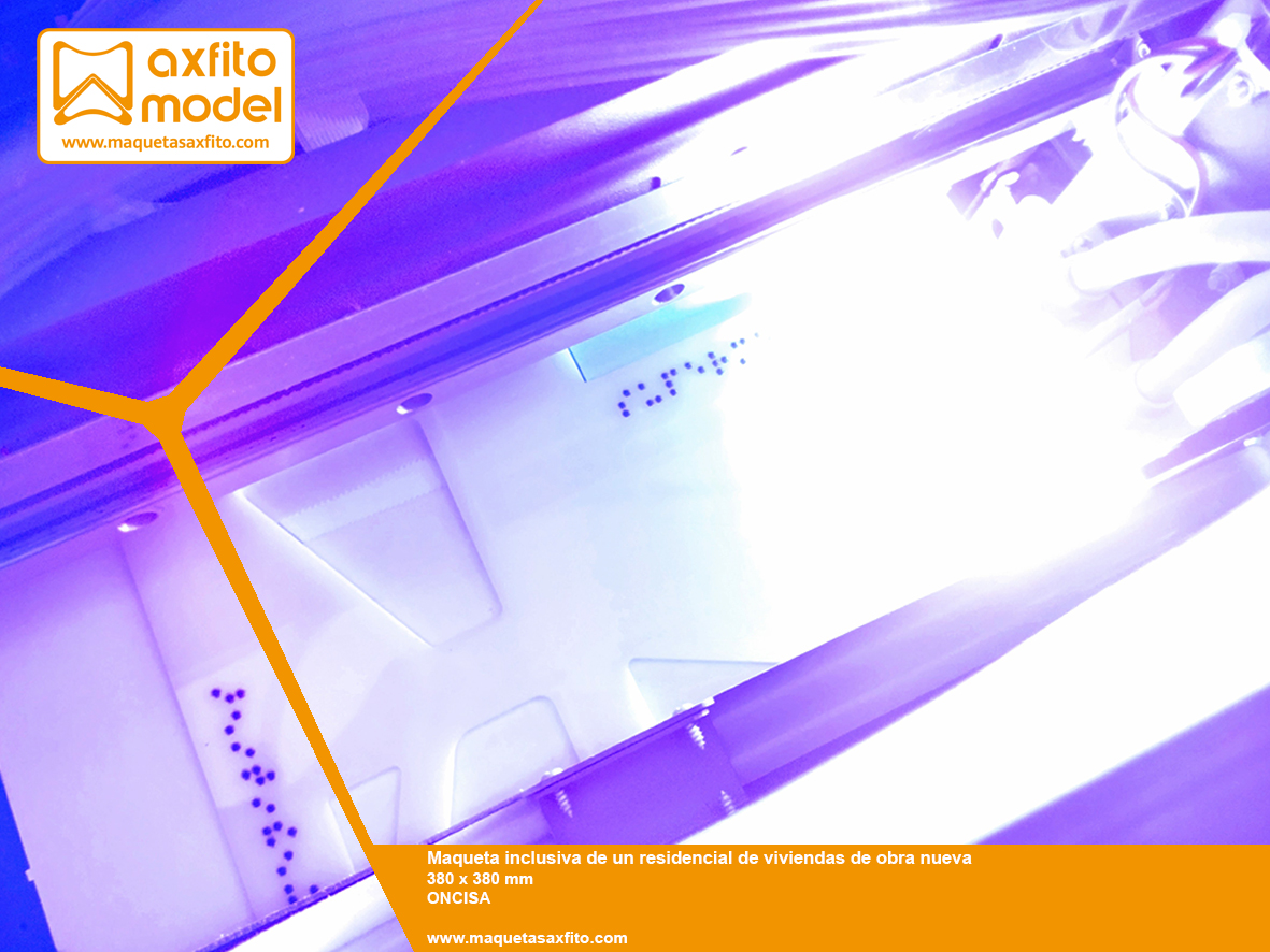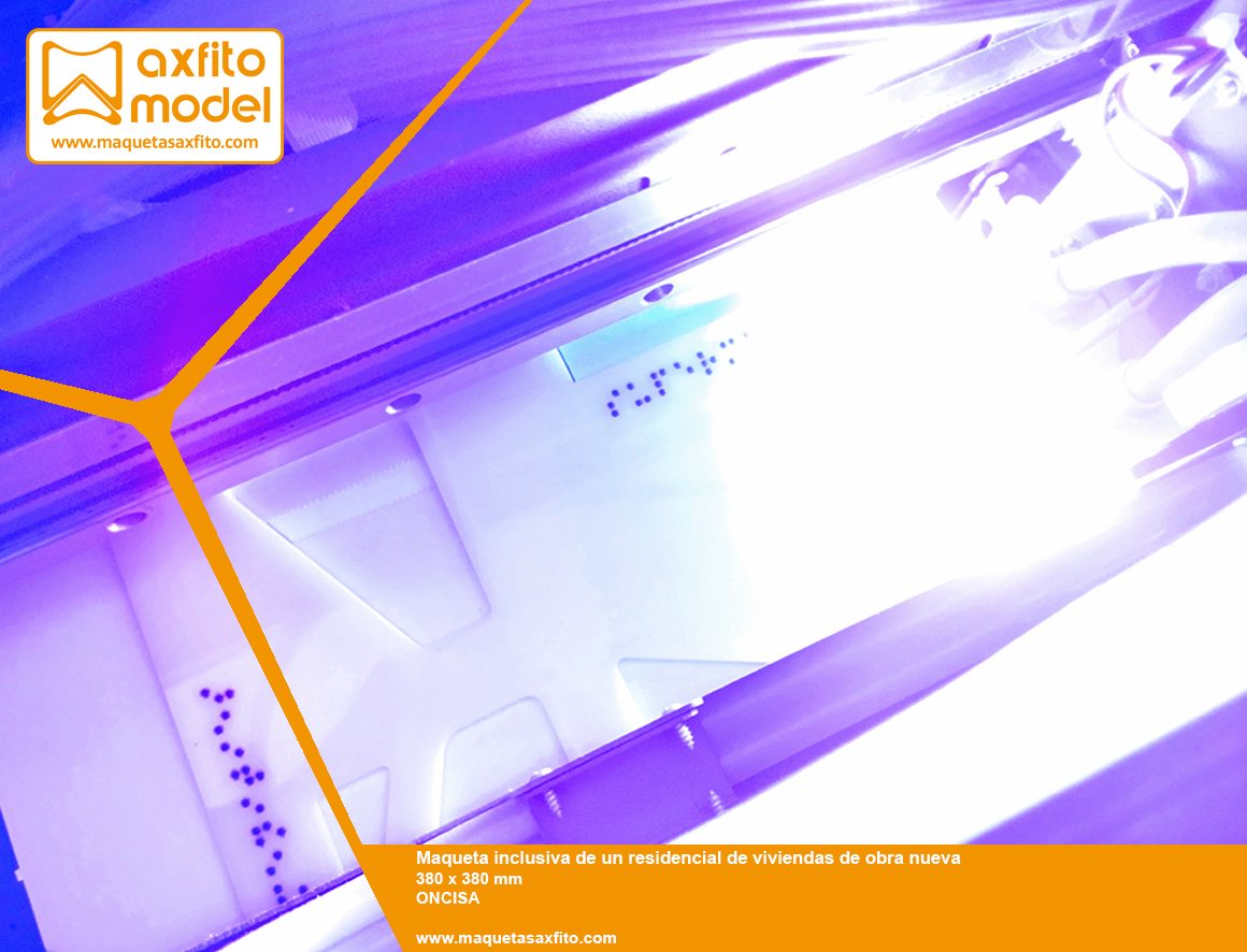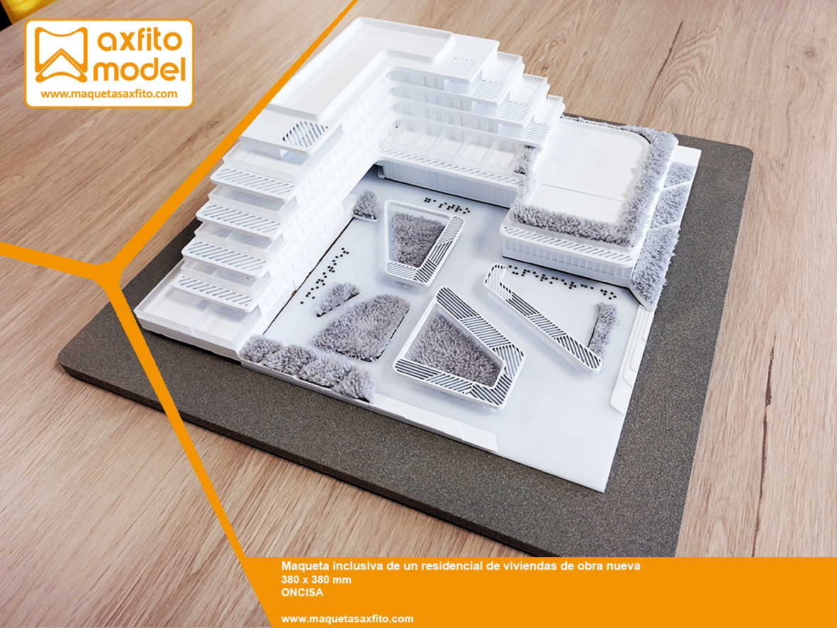 La maqueta ha sido representada a la escala 1:250 y está especialmente diseñada para que las personas ciegas puedan interpretar los detalles y diferentes zonas de interés de este proyecto.