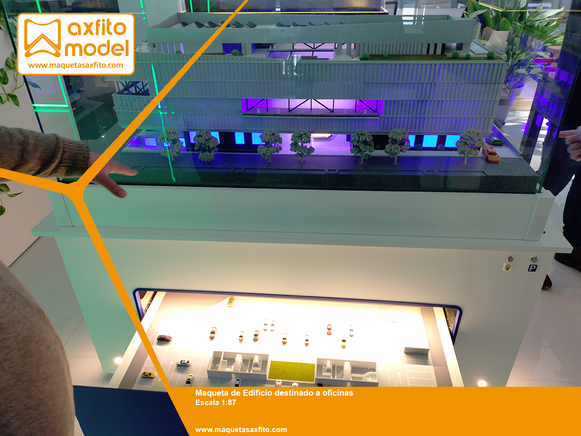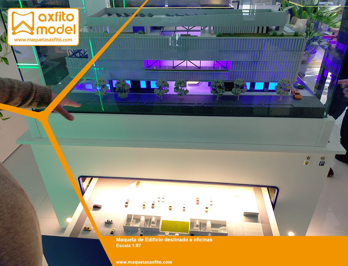 Como elemento singular, la maqueta incorpora una plataforma giratoria en la cubierta, que alberga un vehículo de alta gama, reforzando el carácter exclusivo y tecnológico del edificio, y aportando un punto focal de gran atractivo visual.